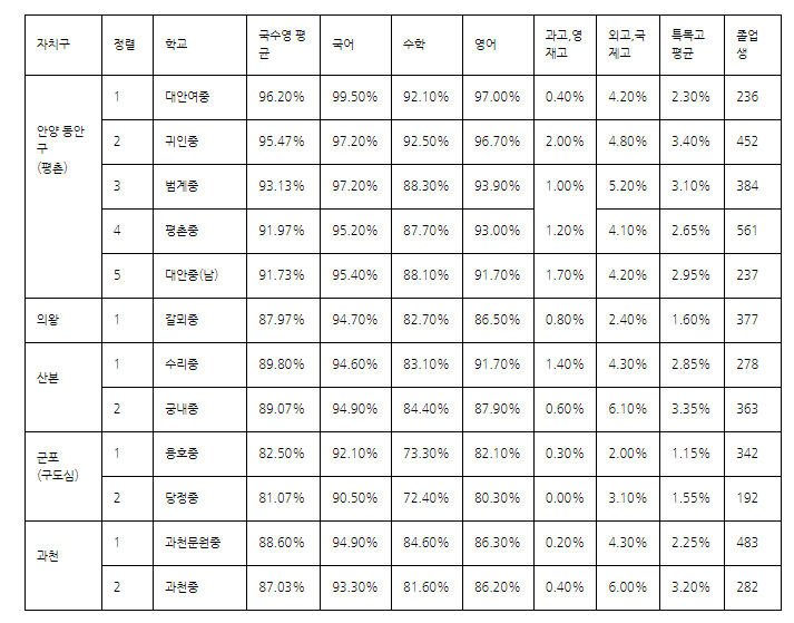 안양권 주요 중학교 2016 학업 성취도 및 특목고 진학률
