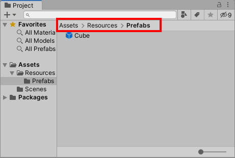 6)Resources 폴더 하위에 런타임에 불러올 에셋들을 위치시킨다. 예에서 Resources 폴더의 하위에 추가적인 Prefabs 폴더를 생성하고 여기에 프리팹 에셋을 위치시켰다.