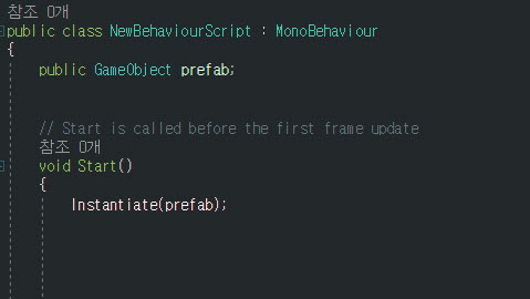 3)일반적으로 스크립트에서 게임오브젝트 타입의 변수를 선언하고 에디터에서 직접 참조시켜서 해당 오브젝트를 복제 및 생성할수있다.