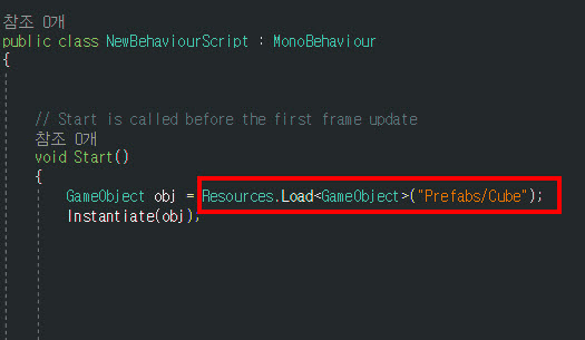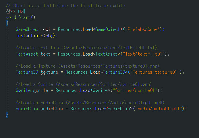 7)스크립트에서 리소스 폴더의 에셋을 불러오기할때 아래와 같이 함수를 호출한다. 예에서 GameObject 유형의 에셋을 해당 위치에서 불러오기한다.