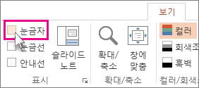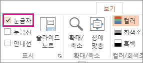 눈금자 표시하려면 보기를 클릭하고 표시 그룹에서 눈금자 을 클릭합니다.