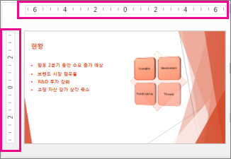 두 개의 눈금자는 활성 PowerPoint 위쪽에 가로로 표시하고 다른 눈금자는 슬라이드의 왼쪽 가장자리를 따라 세로로 표시됩니다(아래 그림).