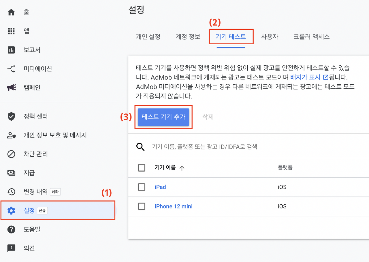 2. AdMob에서 테스트 기기 추가하기