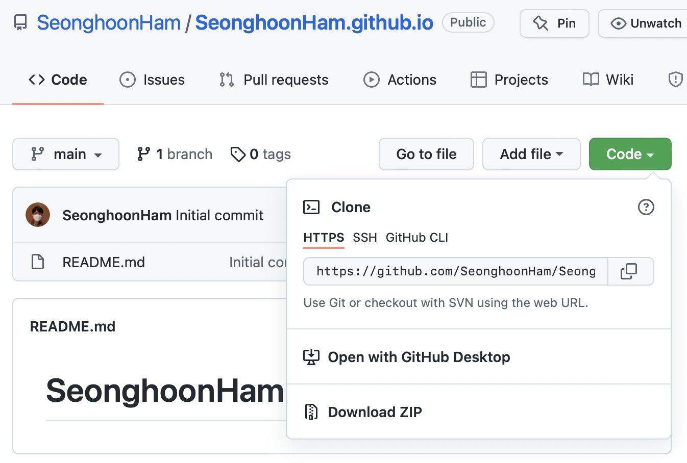 동일한 페이지에서 초록색 Code 버튼을 누르면 Clone을 할 수 있는 주소가 나옵니다.