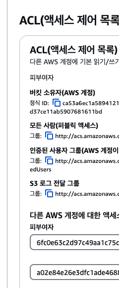 2️⃣ s3 액세스 제어 목록 -> 다른 aws 계정에 대한 엑세스 입력 후 권한 부여