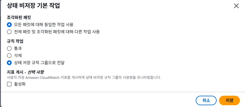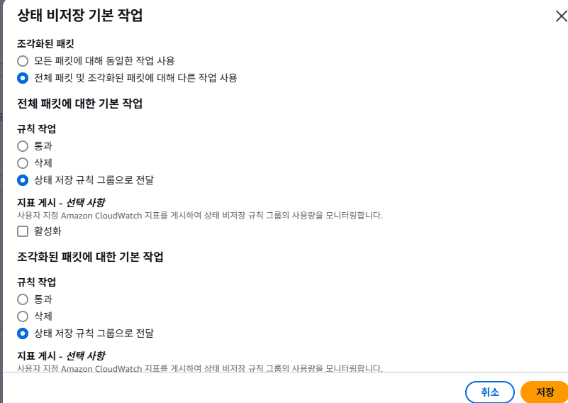 즉, 룰 그룹에 명시적으로 매칭되지 않은 트래픽에 대해 “기본적으로 차단할 건가, 허용할 건가, Stateful로 넘길 건가?”를 지정하는 항목입니다.
