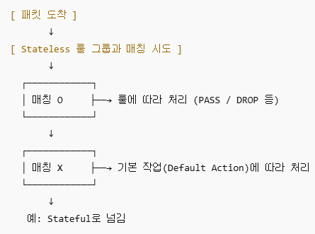| Stateless (상태 비저장) | 트래픽 패킷 각각을 독립적으로 처리 | 빠르지만 세션 정보 없음 |