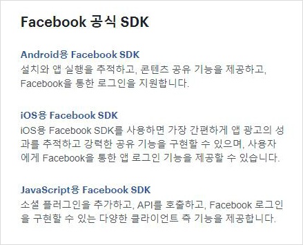 페이스북에서 공식으로 지원하는 SDK로는 안드로이드, iOS, Javascript, React, Swift, PHP 등이 있습니다. 될 수 있으면 페북 공식 SDK로 개발하는 것을 추천합니다.