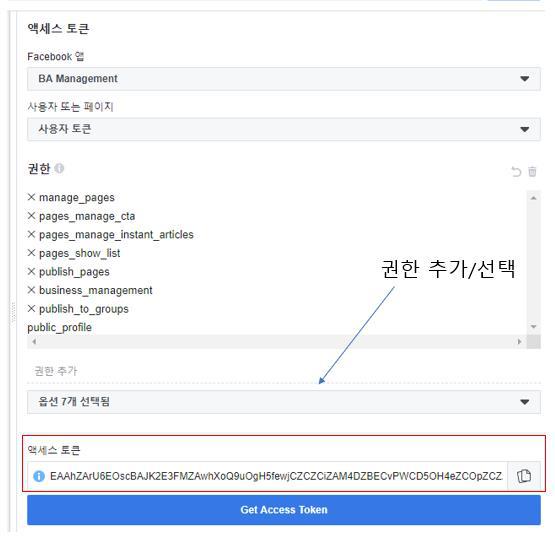 ▼ 이제 Get Access Token 버튼을 누르면 사용자 액세스 토큰이 생성됩니다. 이 토큰 정보와 app id, app secret을 코드에 넣습니다. 아래 코드는 PHP로 개발한 사례로 제 GitHub 레파지토리를 참고하길 바랍니다.