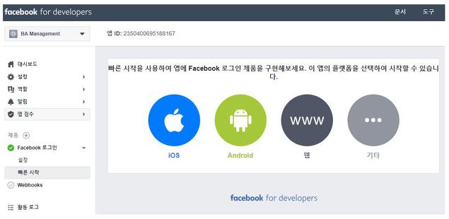 ▼ 간단하게 본인 계정으로 Facebook 로그인 단계를 거치기 위해 왼쪽 메뉴에서 Facebook 로그인 > 빠른 시작을 클릭합니다. 그리고 본인에게 맞는 서비스를 클릭합니다. (여기서는 웹 선택)