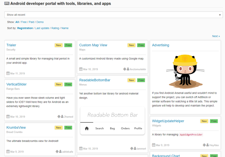 안드로이드 라이브러리 오픈소스 무료/유료/데모 버전이 있습니다. 오래된 사이트임에도 불구하고 최근까지도 계속 업데이트되고 있는 사이트입니다.