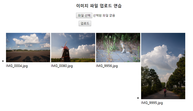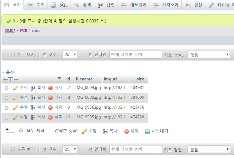 데이터베이스를 확인해 보면 정상적으로 저장되어 있는 것을 확인 할 수 있다. 이제 파일도 업로드 가능하고 데이터베이스에 데이터들도 정상적으로 기록이 되었다. 이제 DB에 있는 정보를 가져와서 페이지에 출력해 보도록 하자. 파일을 선택하는 페이지 하단에 이미지 목록을 출력해 보기로 하자.