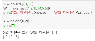 이런식으로 어떤 층의 노드(뉴런)의 개수가 몇 개가 되든 (위에서는 3개) 한 번의 연산으로 이 작업을 빠르게 수행할 수 있다. 행렬의 내적은 신경망에서 아주 중요한 개념인 것이다.