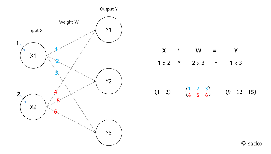 위의 두 포스팅을 먼저 보는 것이 도움이 될 것이다. 다차원 배열의 계산은 앞서 설명한 가중치의 값을 보다 편하게 하기 위해서 행렬 연산을 이용하는 것이다. 한 두개의 신경망 층은 인간이 계산할 수 있을지 모르겠지만 그 이상의 수 많은 차원의 수많은 뉴런층으로 구성된 신경망의 weight를 일일이 계산하는 것은 불가능한 일이다. 이를 컴퓨팅적으로도 쉽게 할 수 있도록 돕는 것이 행렬 연산이다. 이래서 선형대수의 개념을 알아야 했던 것이다. (문과생을 위한 선형대수도 공부하고 조만간 정리할 예정. 우선 위의 포스팅을 참조하자)