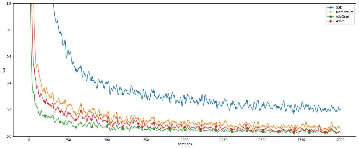 ===========iteration:0=========== SGD:2.37670101396 Momentum:2.33816339389 AdaGrad:2.12533763909 Adam:2.15575092649 ===========iteration:1900=========== SGD:0.154444681428 Momentum:0.020718003123 AdaGrad:0.0183070478127 Adam:0.0222197490211