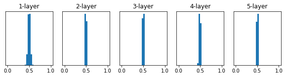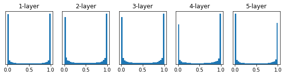 import numpy as np import matplotlib.pyplot as plt def sigmoid(x): return 1 / (1 + np.exp(-x)) x = np.random.randn(1000, 100) node_num= 100 hidden_layer_size = 5 activations ={} for i in range(hidden_layer_size): if i != 0: x = activations[i-1] w = np.random.randn(node_num, node_num) / np.sqrt(node_num) a = np.dot(x, w) z = sigmoid(a) activations[i] = z fig = plt.figure(figsize=(10,2)) for i, a in activations.items(): plt.subplot(1, len(activations), i+1) plt.title(str(i+1) + "-layer") plt.yticks([],[]) plt.hist(a.flatten(), 30, range=(0,1)) plt.show()