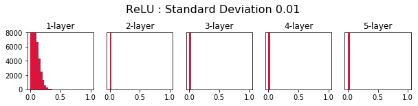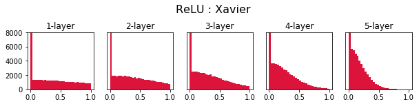 표준편차를 0.01로 한 경우 층이깊어질수록 가중치가 0으로 사라진 것을 볼 수 있으며, Xavier 역시 초반