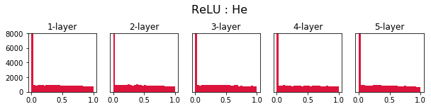 ReLU함수에서 가중치 초기값 설정 방식에 따른 가중치 분포를 확인하면, He가 가장 고르게 나타나는 것을 확인할 수 있다.