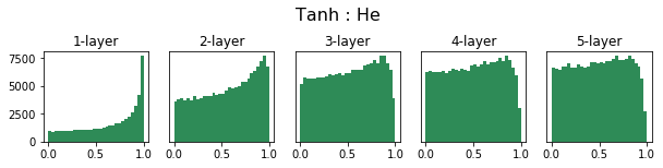 아래 그래프를 보면 앞의 두 방식보다 고르게 분포되어 학습이 효율적으로 이루어질 수 있음을 엿볼 수 있다. 시그모이드 함수를 사용했음에도 표현력의 문제가 발생하지 않는다.