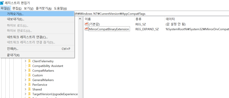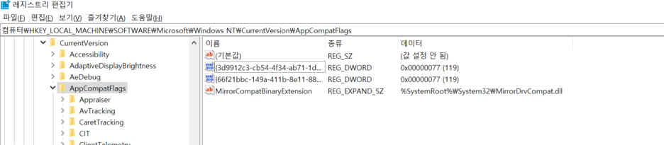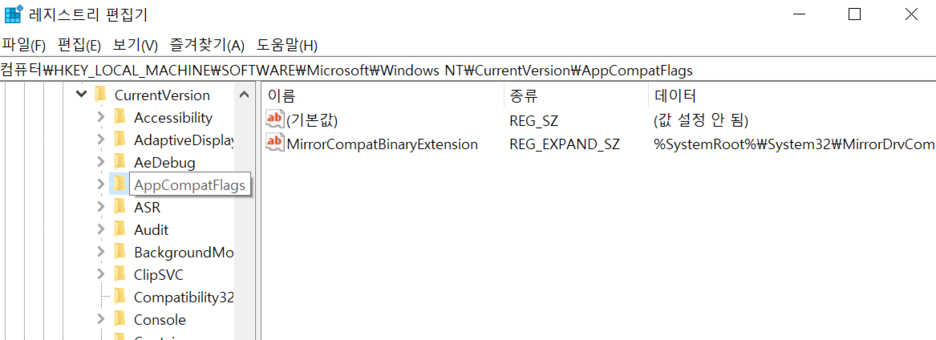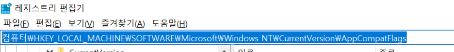 '컴퓨터\HKEY_LOCAL_MACHINE\SOFTWARE\Microsoft\Windows NT\CurrentVersion\AppCompatFlags'
