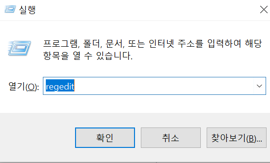 윈도우키 + R을 입력하면 실행창이 나오는데 여기에 regestry editor의 약자로 추정되는(?) reg edit 즉 regedit을 입력해주면 레지스트리 창이 나타납니다.