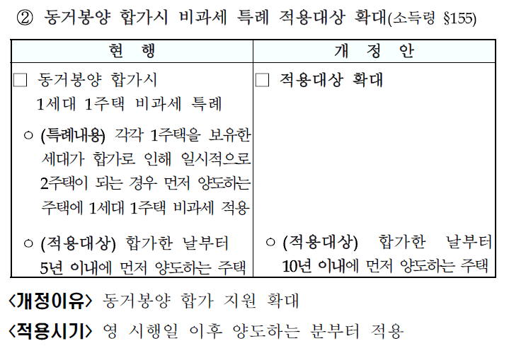 60세 이상의 부모님을 모시기 위해 집을 합쳐 2주택이 된 경우에는 5년 10년(2017년 세법개정안으로 지원 확대, 시행일은 2018년 2월 13일) 이내 한 채를 팔면 비과세 혜택을 받습니다. 효를 장려하는 우리의 문화와 적절한 궁합을 보여주는 정책이죠. ^^;
